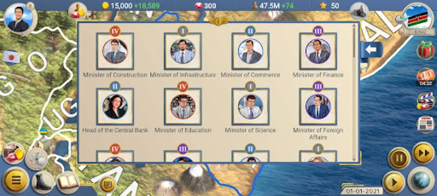 Ndani ya mipaka yako, dhibiti masuala ya serikali kwa uangalifu. Tunga sheria mpya, badili itikadi ya kitaifa, na uchague dini rasmi kutoka kwenye orodha ndefu ikiwemo Uprotestanti, Ukatoliki, Uyahudi, Uislamu, Uhindu, Ubudha, na Ushinto. Amua iwapo nchi yako itakuwa ya kihafidhina, kiliberali, kisoshalisti, au itikadi nyingine yoyote. Aidha, jenga uchumi imara kwa kuzalisha rasilimali muhimu kama chakula, mafuta, dhahabu, na umeme. Jenga viwanda, migodi, na viwanda vya magari, huku ukisimamia kodi na mikopo ya benki kuu ili kuhakikisha ustawi endelevu. Ili kukuza nchi yako, anzisha na ufadhili wizara muhimu kama Elimu, Afya, Miundombinu, na Ulinzi, ukiteua mawaziri mahiri ili kufikia viwango vya juu duniani.