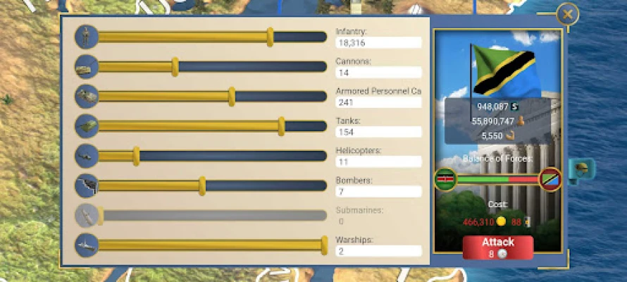 Kwenye medani ya siasa za kimataifa, sauti yako ni muhimu. Shiriki kikamilifu katika diplomasia ya ulimwengu kwa kujenga balozi, kuweka vikwazo, au kusaini mikataba muhimu ya kutovamiana na miungano ya ulinzi. Katika Umoja wa Mataifa, wasilisha maazimio, piga kura, na uweke vizuizi vya kiuchumi au silaha. Wakati diplomasia inashindwa, amuru jeshi lako lenye nguvu lisilo na kifani. Kutoka kwa wapiganaji wa miguu na silaha nzito hadi helikopta na manowari, kila kitengo kiko tayari kwa vita. Anzisha uvamizi, fanya mapinduzi, tuma wapelelezi, na hata anzisha vita vya nyuklia ili kudai ushindi wako kwenye uwanja wa vita, ukisimamia maeneo yaliyotwaliwa.