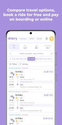 Gundua ulimwengu mpya wa usafiri wa Ulaya na Sharry, rafiki yako wa kuaminika anayekupa uhuru usio na kifani na wepesi. Tumeunda mfumo bunifu unaokuruhusu kuhifadhi safari yako sasa na kulipa baadaye, iwe mtandaoni au unapopanda. Kwa kuzingatia safari za masafa marefu kote Ulaya, Sharry inakuunganisha na maelfu ya watoa huduma, kukupa fursa ya kuchagua usafiri unaofaa mahitaji yako, iwe basi, gari dogo, au kushiriki gari. Sahau kuhusu usumbufu wa mipango ya usafiri na karibisha safari laini na isiyo na wasiwasi.