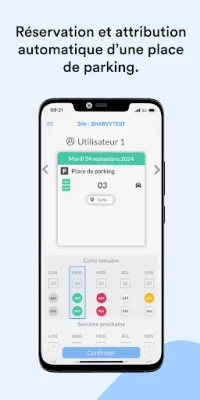 Sharvy inaangazia seti kamili ya vipengele vilivyoundwa kurahisisha shughuli za kila siku. Wafanyakazi wanaweza kwa urahisi kuhifadhi au kuachilia nafasi zao za maegesho na vituo vya kazi, sambamba na kuweka nafasi kwenye mkahawa wa kampuni. Mfumo wetu mahiri hutumia algorithm ya kisasa kugawa nafasi kiotomatiki, ikizingatia vipaumbele vilivyowekwa na msimamizi na muundo wa timu ya kazi. Programu pia inatoa udhibiti kamili wa aina mbalimbali za nafasi za maegesho—kama vile magari madogo, SUV, baiskeli, pikipiki, magari ya umeme, au yale kwa ajili ya watu wenye ulemavu—pamoja na usimamizi wa kina wa nafasi za kazi. Unaweza pia kuweka viwango maalum vya matumizi ya nafasi na kutumia ramani shirikishi inayoonyesha hali halisi ya maegesho na vituo vya kazi. Ili kuongeza usalama, Sharvy inaunganishwa na mifumo ya kudhibiti ufikiaji wa maegesho kupitia kamera zinazotambua namba za magari au kupitia programu ya simu, na pia inaruhusu usimamizi wa likizo na inaungana na mifumo ya SIRH.